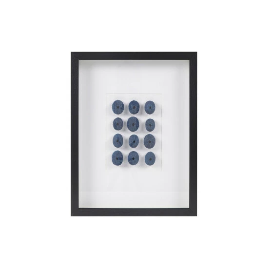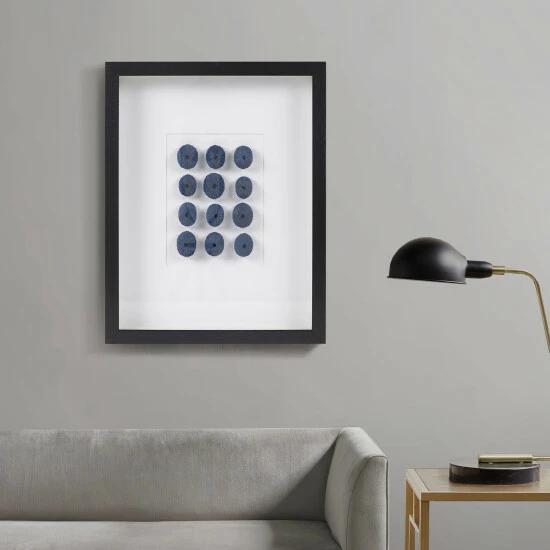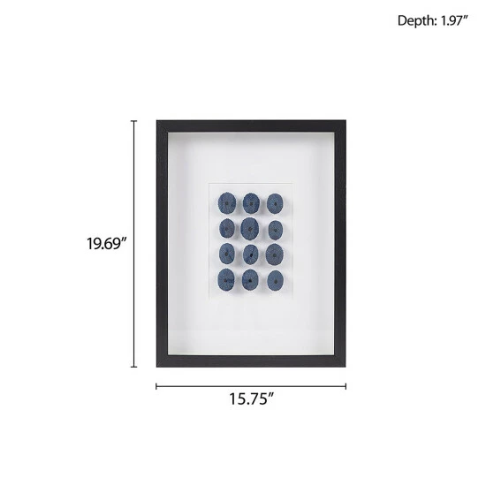 Our Martha Stewart Indigo Shells Real Natural Sea Urchin Framed Shadowbox brings a modern coastal update to your home decor. This shadowbox wall art features 100-percent real sea urchin shells that are cut, dyed, and placed under glass, for an elevated and unique look. The single matte base creates a gallery look and feel, while the black MDF frame adds a striking complementary touch to the design. 4 D-rings on the reverse make it easy to hang this piece either horizontally or vertically, fitting to any decor or space in your home. Shape and size of sea urchin shells may vary slightly from image due to the natural properties of each shell, making each piece unique on its own.