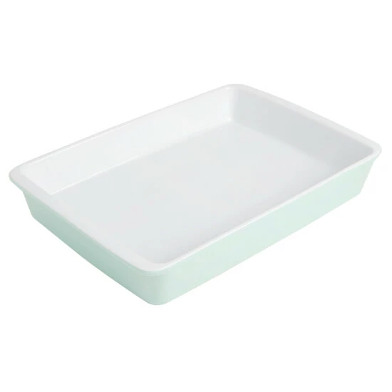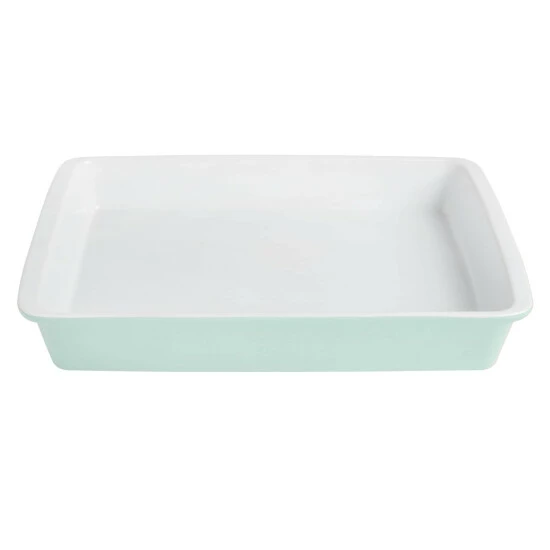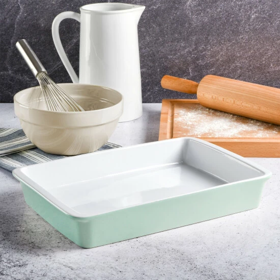 The Martha Stewart 12.75 Inch x 9 Inch Stoneware Baker in Mint is the perfect dish for presenting astounding dinners. Bring food straight from the kitchen oven to table. The bright colored stoneware body helps maintain heat while brightening the room with its vibrant color. The set is dishwasher safe and microwave safe for easy and convenient use. Serve guest tasty peach cobblers, warm quiche, or savory scalloped potatoes.