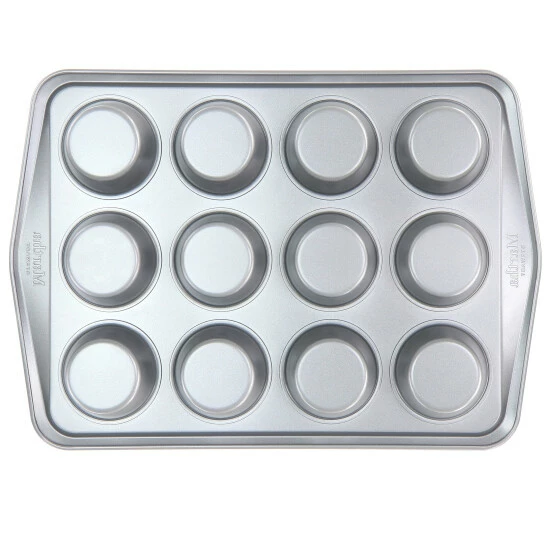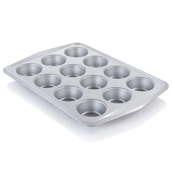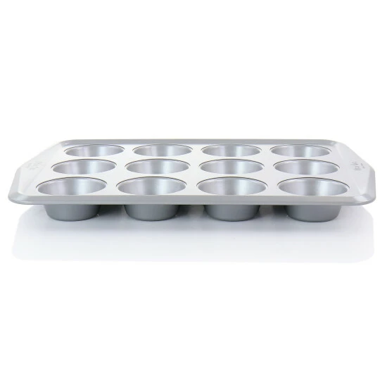Bake to your heart’s content with the Martha Stewart 12 Cup Nonstick Carbon Steel Muffin Pan in Gray. The warp resistant baking pan evenly heats and browns. Features wide handles and rim for easy handling and durability. The nonstick coating provides quick food release for perfect muffins. From long lasting care, its recommended to hand wash. Bake banana nut muffins, bite sized quiche, or mini custard tarts for family and friends to enjoy!