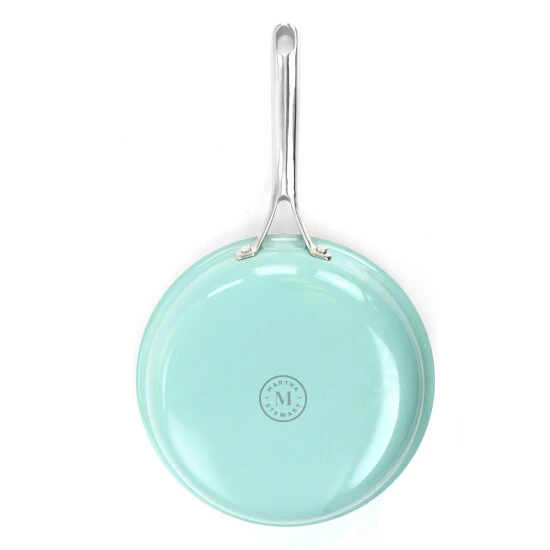 Enjoy making all your favorite home cooked meals with the Martha Stewart 12 Inch Aluminum Frying Pan in turquoise. Made of durable heavy gauge aluminum for even heat distribution. The reinforced triple-layered nonstick interior makes it super easy for food release. The beautiful turquoise porcelain enamel exterior adds a long lasting shine and quick clean up. The riveted stainless steel handles adds stability and strength, complete with holes for hanging storage. It is oven safe up to 480 degrees Fahrenheit and is PFOA-free. This Martha Stewart frying pan is just one of the amazing pieces you can get for your home kitchen. Complete the entire collection to truly feel right at home.
