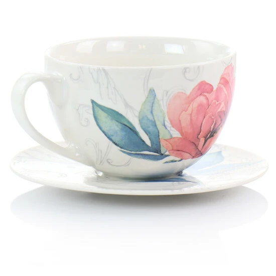 The Martha Stewart 12 Piece Ceramic Flora 18 Ounce Cup and Saucer Set in White is the perfect addition to any weekend brunch get-together. Each piece features a water color like floral design that flows from the cup down to the saucer. The ceramic body is durably made with a high quality weight that’s ideal for warm drinks. It’s dishwasher safe and microwave safe for fast and convenient use. Enjoy tea with friends, make serve yourself a unique cup of coffee, or indulge in helping of chocolate mousse.