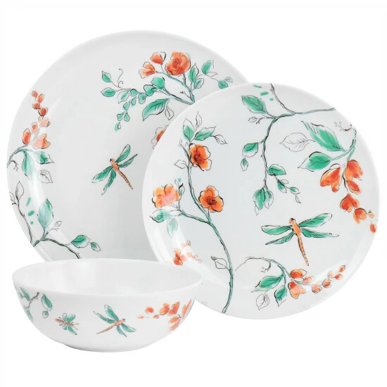 This Dragonfly dinnerware set by Martha Stewart is whimsical, fun, and perfect for light outdoor or indoor dining. This set includes four dinner plates, four salad plates, and four cereal bowls, each with a watercolor floral design. The lightweight melamine material is durable and long lasting, making it easy to use with kids or on days when eating outside sounds better! Top rack dishwasher safe means easy and fast clean up.