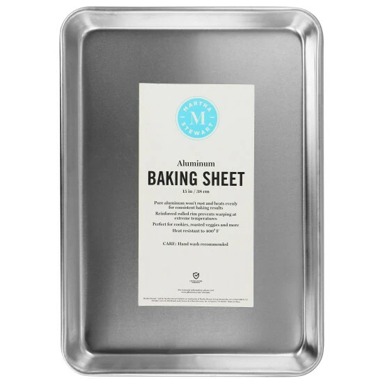 Bake all your favorite dishes with the Martha Stewart Baking Sheet. Whether its cookies or roasted veggies, make this the perfect addition to your kitchen and treat all your friends and family. Made of pure aluminum that won’t rust and heats evenly for consistent baking results. The reinforced rolled rim prevents warping at extreme temperatures. Heat resistance up to 400 degrees Fahrenheit.
