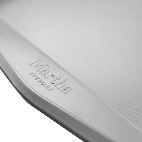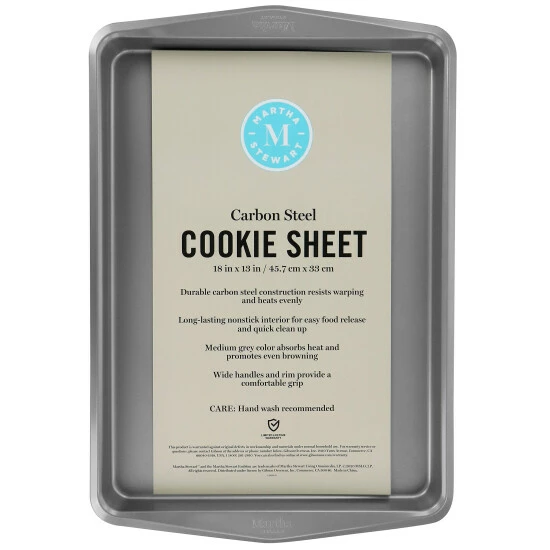The Martha Stewart 18in Cookie Sheet is constructed with durable carbon steel that resists warping and heats evenly. Long lasting nonstick interior for easy food release and quick clean up. Medium grey color absorbs heat and promotes even browning. Wide handles and rim provide a comfortable grip.