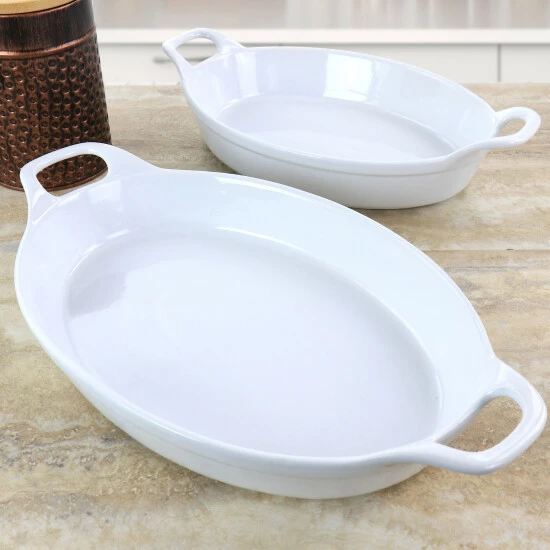 Enjoy baking all your favorite desserts in this Martha Stewart 2 Piece Stoneware Baker Set in White. Made of strong stoneware, perfect for baking. Features a 2 piece set, one 11 Inch baking pan, one 9.5 Inch baking pan. Treat all your guests with delightful cakes, brownies, and much more. This Martha Stewart baker set is just one of the amazing pieces you can get for your home kitchen. Complete the entire collection to truly feel right at home.