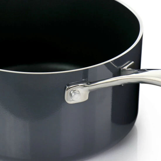 The Martha Stewart 3.5 Quart Nonstick Aluminum Saucepan in Dark Gray with Glass Lid is the ideal saucepan for any home chef. The nonstick coating allows for more forgiving cooking and provides a fast cleanup. Its aluminum body evenly distributes heat and is oven safe up to 480F. For long lasting quality its recommended to hand wash the cookware. Make a stunning tomato sauce, hearty potato soup, or whisk together vanilla custard.