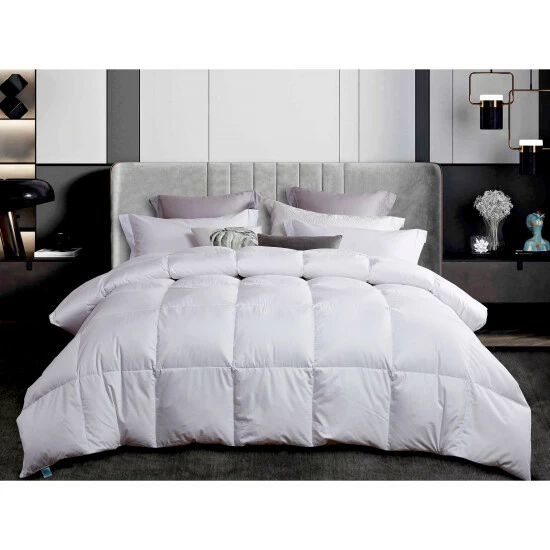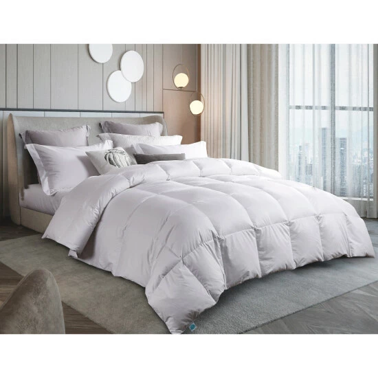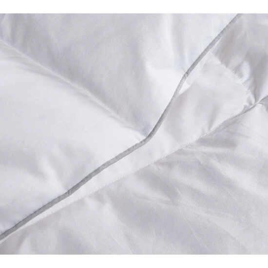 Cozy and classic, this down comforter by Martha Stewart will add the perfect touch of contemporary class to your bedroom decor. The comforter features a soft, 300 thread count white cotton shell, and a white down fill that provides warmth and loft without being too heavy. End to end box stitching prevents the fill from shifting, adding durability and style to this charming comforter.