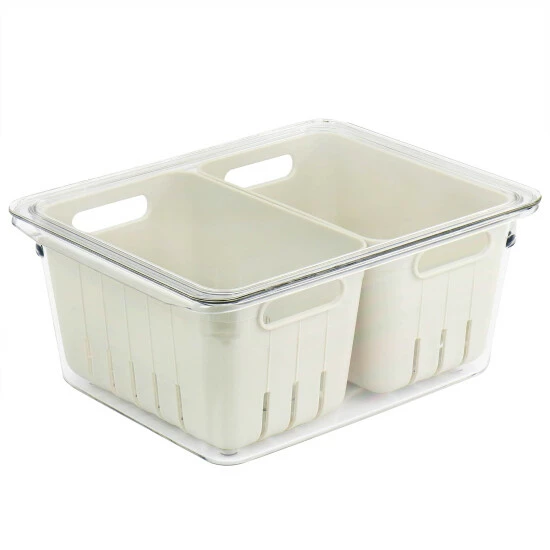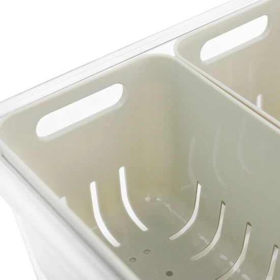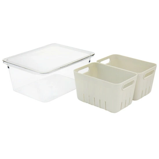 This Martha Stewart Fresh Keeper Container is the perfect container when you need to keep food well ventilated and well contained. This set comes with dual removable baskets and an outer container. The removable baskets can act as colanders to wash produce, while the elevated bottom promotes airflow and a space for liquid drainage to prevent spoiling. The dual basket design is perfect for storing small produce separately; easily store grapes and berries in one container and save some space! This Dual function set can be used as one piece or separated and saves you space with its stackable storage design!Hand Wash OnlyMaterial: Plastic (BPA Free)Color: Clear/BeigeElevated Bottom Promotes AirflowStackable Space Saving DesignTwo Removable Colander Baskets for Dual FunctionalitySet Includes:Two Removable Colander BasketsOne Plastic ContainerOne LidItem Measurements:Colander Baskets: 6in length, 3.8in width, 3.5in height, 0.15lb weightStorage Bin with Lid: 8.8in length, 6.7in width, 3.9in height, 0.75lb weight