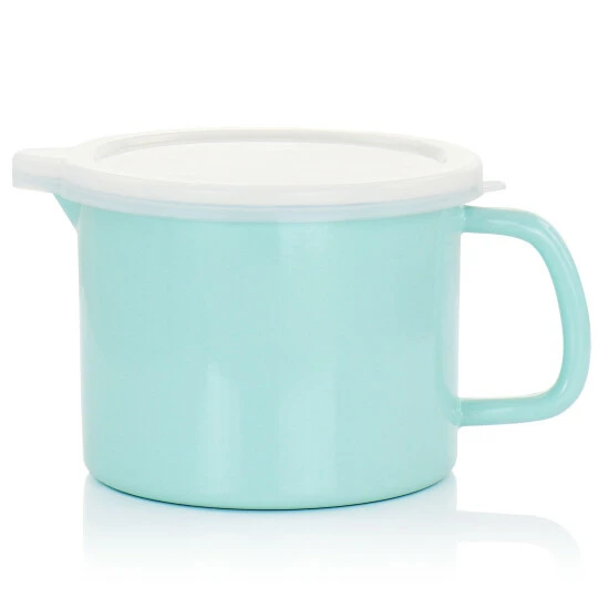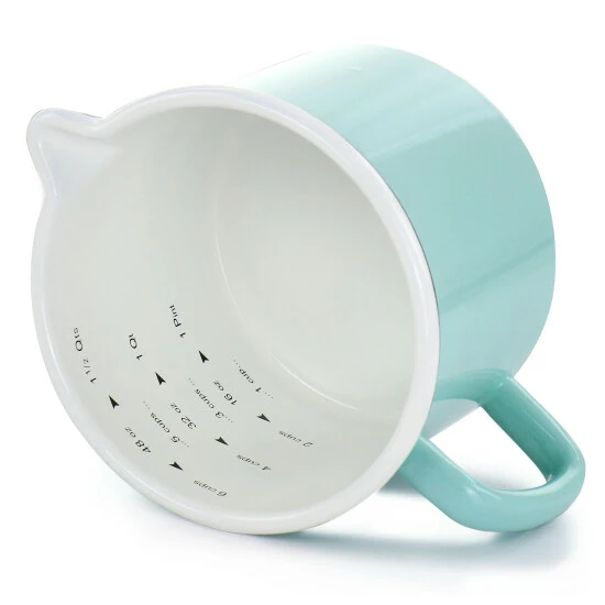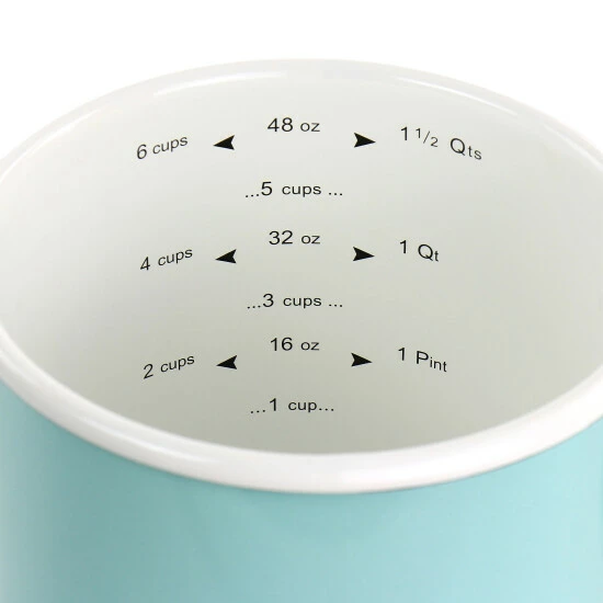 This Martha Stewart 6 cup measuring cup is the perfect combination of stylish and functional. Prepare your favorite meals with this handy tool. Large size holds up to 6 cups/48oz of liquid, making this measuring cup perfect to use while preparing soups, pastas, and other dishes with higher liquid content. Features marked cup and liter lines on the inside for easy measuring and a pour spout to prevent spillage. Constructed with enamel coated steal that is durable, long lasting, and chip resistant. Hand wash only, not microwave safe.