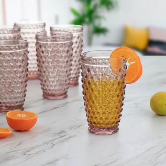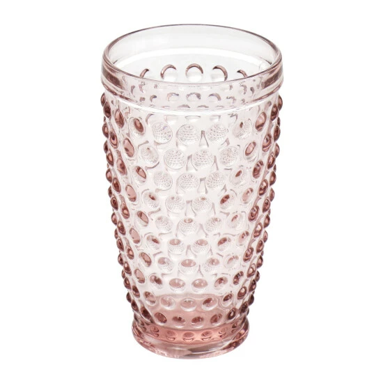 The Martha Stewart 6 piece tumbler set is constructed with handmade glass for durability and long lasting use. This set has a unique embossed polka dot design and a tinted pink hue that will add a fun look to your table. This set comes complete with 6 tumblers in a stack-able design for easy cabinet storage. Add these accent tumblers to your every day drinkware for a touch of class and style!Color: Tinted PinkMaterial: Hand Made GlassDesign: Embossed Polka DotSix Piece SetTop Rack Dishwasher SafeDo Not MicrowaveSet Includes:Six 14.3oz Glass TumblersItem Dimensions:5.75in height, 3.25in diameter, 14.3oz capacity, 1lb weight