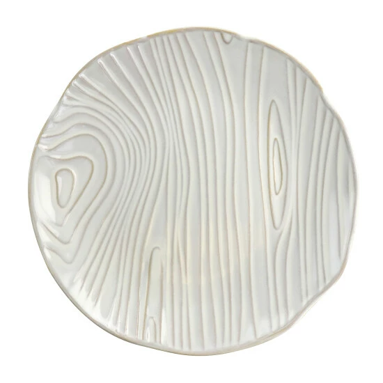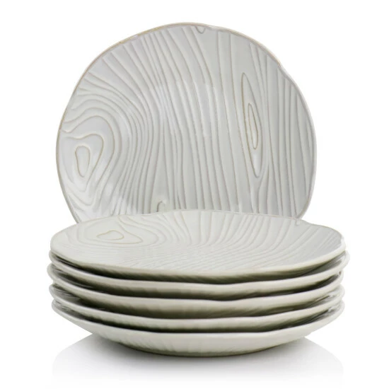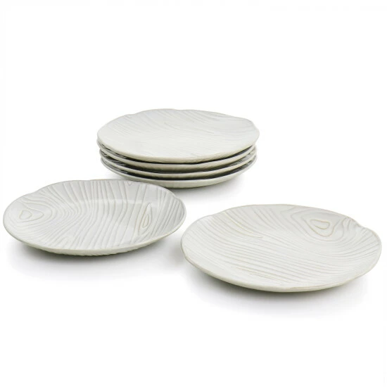 The Martha Stewart 6 Piece Wood Patterned Dessert Plate Set will add a fun but classy texture to your every day dishware. These plates are designed with a polished wood grain texture and an uneven rim for a unique look and feel. These plates will soon become your go to, they are a glossy white with undertones of beige where the wood grain lines are. Completely dishwasher and microwave safe for easy and convenient reheat and clean up. Add some fun texture and style to your table with these plates!