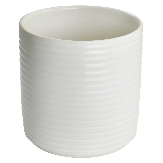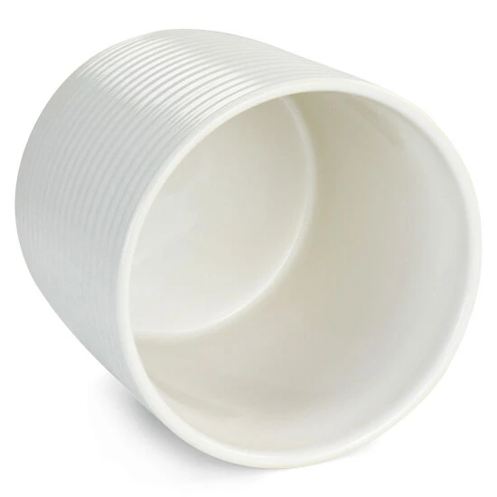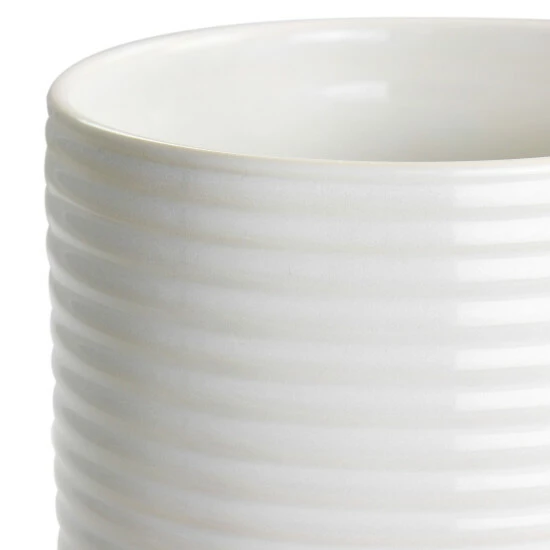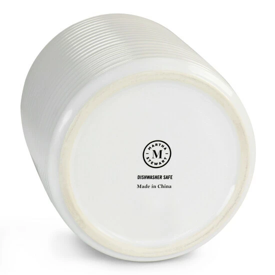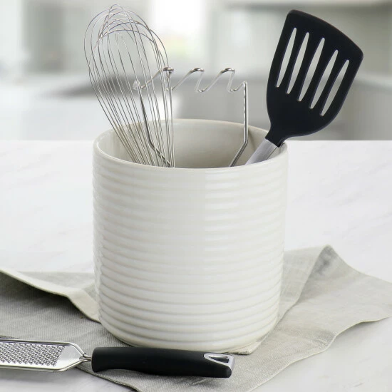 In need of some drawer space and heightened kitchen organization? This 7 inch stoneware utensil crock by Martha Stewart is the perfect solution! This large storage piece is made with a 7in diameter and 7in height, offering space for all your go-to utensils, in the kitchen or in other rooms of your home! An embossed stripe design adorns this crock with a glossy finish for a sleek and subtle design piece that goes beautifully with most kitchen and home decor. Not only is this crock space saving and functional, but it also is dishwasher safe so keeping it clean is a breeze.