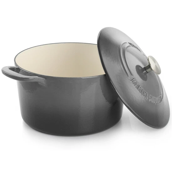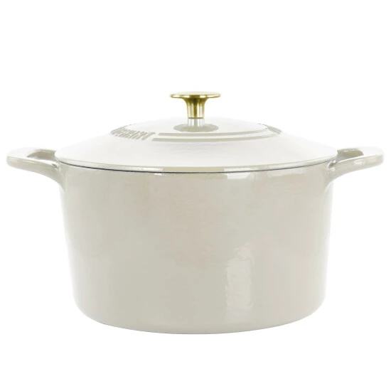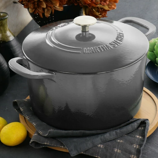 Take full advantage of the Martha Stewart Enameled Cast Iron Dutch Oven and its endless possibilities. The cookware features a bright and bold colored enameled finish, bringing style in to the kitchen. The self basting lid adds more flavor and moisture to any home recipes. It’s stovetop and oven safe for cooking a larger array of dishes. Surprise family and friends with delicious stews, savory curries, baked sweets and more!