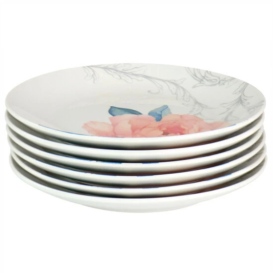 This 6 piece plate set by Martha Stewart is sure to dress up your table beautifully while still keeping it simple. Each plate has a leafy vine illustration with a blooming flower on one side that adds a touch of classic style to these plates. Constructed with fine ceramic, this set is durable, long lasting, and perfectly microwave and dishwasher safe. Dress up your table with this decorated Martha Stewart dessert plate set!