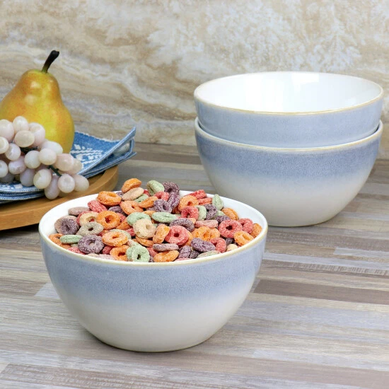 Serve guest with the stunning display of the Martha Stewart Blue Rim 6 Inch 6 Piece Stoneware Cereal Bowl Set. These stoneware bowls fashion a natural off white color with a shore like blue gradient that trickles down the rim. The stoneware body gives a satisfying weight to every piece while providing proper durability. For ideal convenience, this bowl set is dishwasher and microwave safe. Enjoy a hearty bowl of cereal in the morning, cozy up to some tomato soup, or delight yourself to generous helping of ice cream.