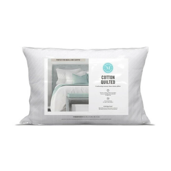 Sink into comfort with the extra cushiony Cotton Quilted twin pack from Martha Stewart. Our plush, 100% cotton moisture wicking shell features a beautiful 2-inch diamond quilt pattern to provide an extra layer of comfort, while keeping you cool, dry and comfortable throughout the night. The 2-inch gusset not only allows the pillow to fully loft, but also provides and even, edge-to-edge sleep surface – ideal for back and side sleepers. Our exclusive Confora-Foam™ fill features adjustable memory foam clusters that mold to the specific shape of your head and neck, while still allowing you to switch positions easily throughout the night. These pillows are finished off with a pearly white satin cord and Martha Stewart logo gusset label.