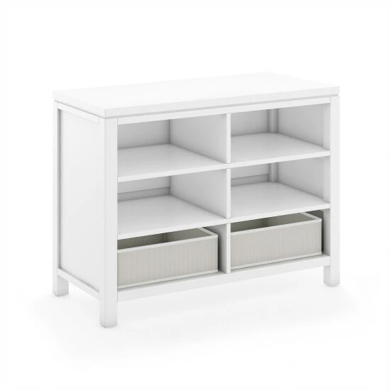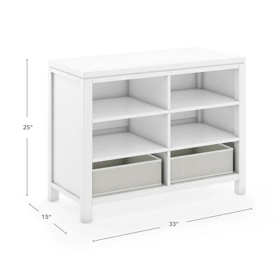 Comprised of unique storage solutions, functional work spaces and special places to curate and display children’s art, the Martha Stewart Crafting Kids’ Collection by Guidecraft inspires a child’s artistic expression. Innovative designs along with quality pieces, together establish a comprehensive, child-centered space to create using a variety of media. Constructed from a durable combination of easy-to-clean solid pine and engineered wood, the Kids’ Double Open Storage – White keeps art supplies and crafting materials organized. This versatile unit features three shelves divided into six equal compartments. Included two heavy duty, woven bins keep paint, yarn, glitter, beads and more all within reach. Assembly required. Measures 33″L x 15″W x 25″H.
