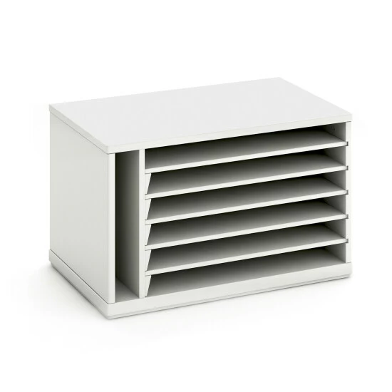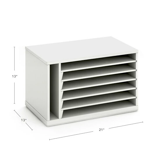 ย Comprised of unique storage solutions, functional work spaces and special places to curate and display children’s art, the Martha Stewart Crafting Kids’ Collection by Guidecraft inspires a child’s artistic expression. Innovative designs along with quality pieces, together establish a comprehensive, child-centered space to create using a variety of media. Constructed from a durable combination of easy-to-clean solid pine and engineered wood, the Kids’ Paper Organizer – White is the perfect tabletop unit to keep papers organized and accessible in children’s art spaces. This single-sided shelving unit features multiple shelves sized to fit various types of paper in multiple colors. Measures 21″L x 13″W x 13″H.