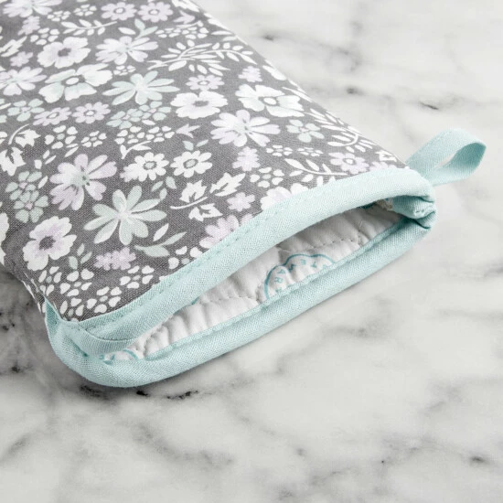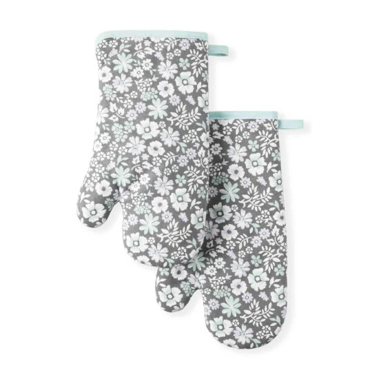 Add style and function to your kitchen décor with the Martha Stewart Ditsy Floral Oven Mitt Set 2-Pack. Made from thick cotton fabric with cotton lining that offers comfort and insulation. This floral print oven mitt set includes two oven mitts that each measure 7 inches wide by 13 inches long for easy on and off use. They are heat resistant and will shield your hands from the heat. Includes a convenient hanging loop for display or easy storage. Machine washable for easy cleaning.