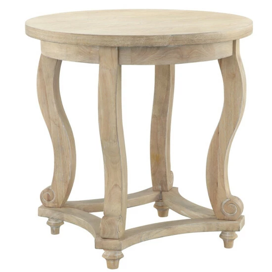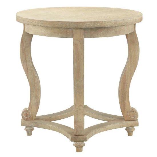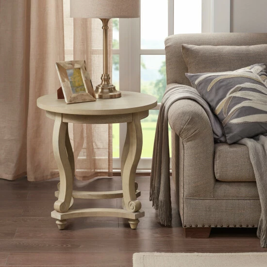 Create a warm and welcoming look in your home with the Martha Stewart Elmcrest End Table. This round end table features a natural finish on the solid veneer top and curved solid wood legs, for a charming farmhouse look. Showcasing its simple and clean design, this wooden end table adds a fresh update to your living room decor. Assembly is required and tools are included.