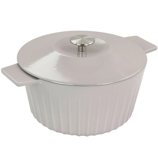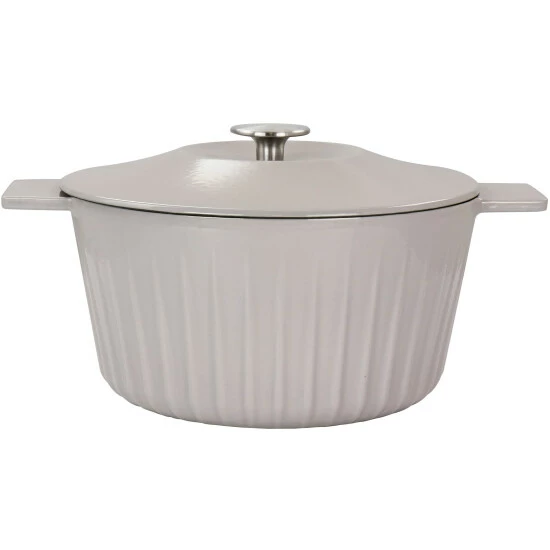 This medium 5 quart enameled cast iron dutch oven is the perfect combination of versatile and stylish. Constructed with durable cast iron that distributes and retains heat evenly, helping you to cook and bake your favorite dishes with the best result. Enameled surface is nonstick and easy to clean and the integrated handles let you move from stove to oven to table with ease. Beautiful and simple embossed stripe on outside adds an element of design. This pot is perfect for cooking, baking, reheating, and serving. Oven safe up to 500 Degrees Fahrenheit Use pot holders whenever moving or lifting hot cookware. Compatible on all cooking surfaces including the oven, broiler, and on the barbecue. Not dishwasher safe, do not use metal utensils. Hand wash only.