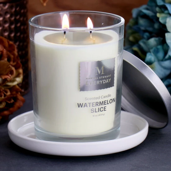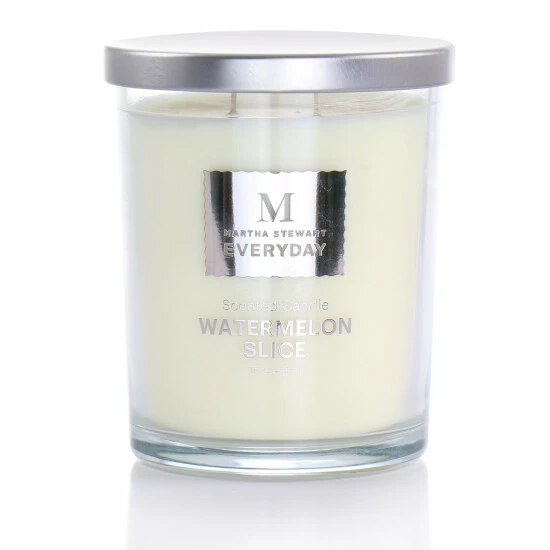 Freshen up the air in the room with the Martha Stewart Everyday 16 Ounce Watermelon Slice Scented Candle. This candle features the sweet scent of watermelon slices, with a vibrant colored wax body all within a glass container. The 16oz size and dual wick setup allows for more scent to be thrown out in large rooms. Perfect to have around dining rooms, living rooms or large bedrooms. be sure to always burn within sight and no longer than 3 hours at a time.