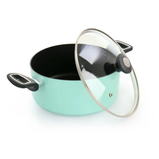 This 5 quart dutch oven by Martha Stewart is the perfect combination of style, quality, and convenience. The durable forged aluminum body is perfect for braising, stewing, and boiling. Featuring soft touch handles that stay cool for easy transport, and a nonstick interior for low oil cooking and easy cleanup. Comes with a tempered glass lid that allows safe monitoring of your cooking progress. And to top it off, this dutch oven is compatible with all stove tops including induction!Material: forged aluminum/tempered glassColor: TurquoiseEnameled outerCool touch handlesGas, Electric, Induction, Halogen, and Vitroceramic CompatibleHand wash recommendedIncludes:One 5qt Dutch OvenOne Tempered Glass LidPer Item Measurements:15.2in length, 9.9in diameter, 4.25in pot height, 6.5in height with lid, 3.6lb weight