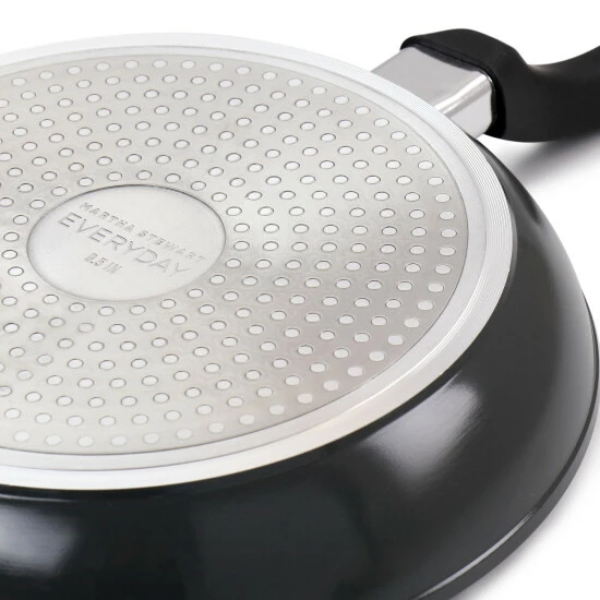 This 9.5 Inch frying pan by Martha Stewart is made with a heavy duty forged aluminum body that provides strength and durability. The long lasting construction features a nonstick interior coating for low-fat cooking as well as easy clean up. Bakelite handle with soft-touch coating stays cool for easy mobility from burner to burner. This pan is finished with a polished outer enamel coating and is compatible with all stove tops, including induction.Material: Heavy duty forged aluminumColor: GreyBakelite cool-touch handleNonstick interior coatingEnameled outer coatingCompatible with gas, electric, induction, halogen, and vitroceramic stove topsHand Wash RecommendedIncludes: One 9.5in Frying PanPer Item Measurements:17.3in length, 9.6in width, 1.8in height, 1.45lb weight