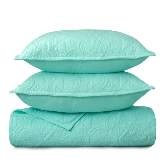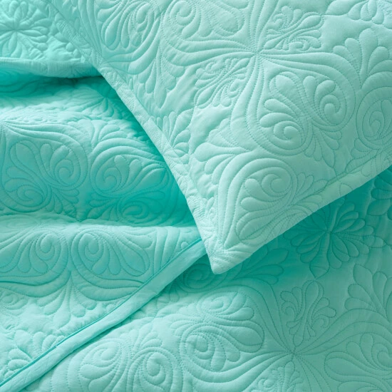 - Features a self-reversing traditional quilted design on a solid aqua background.Β