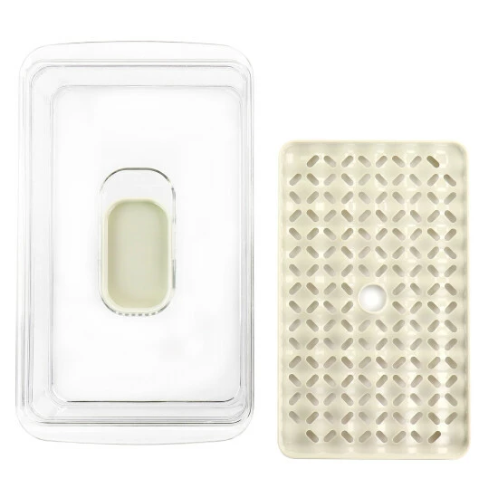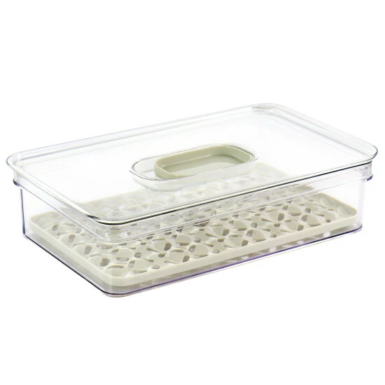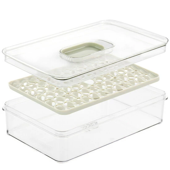 This Martha Stewart Fresh Keeper Container is the perfect container when you need to keep food well ventilated and well contained. This set comes with a removable bottom separator, an outer container, and a lid with vented slider. The removable bottom will keep your food elevated from the bottom to promote airflow and a space for liquid drainage in order to prevent spoiling. Vented lid at top controls humidity to keep different food types fresh. This Dual function set is perfect for storing fresh ingredients and prolonging the life of your food!