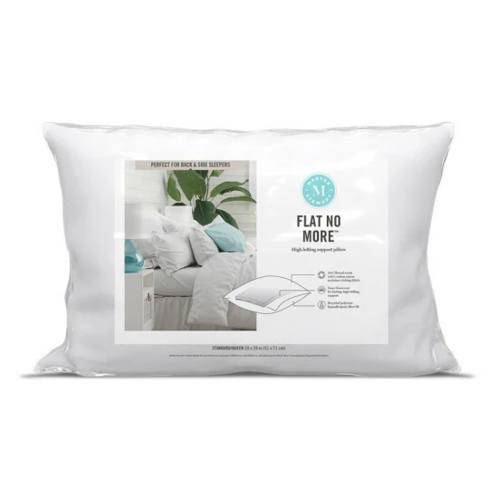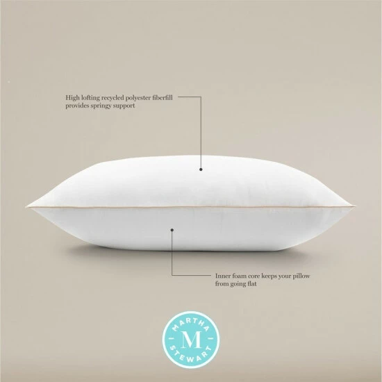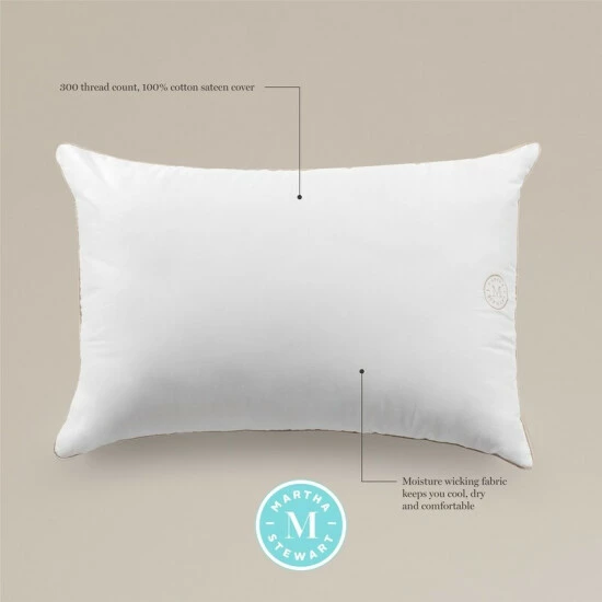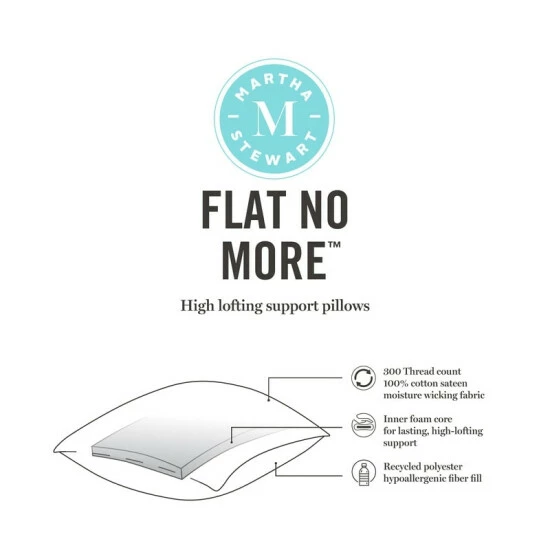 Now you can say “No More!” to flat pillows with the Martha Stewart Flat No More twin pack bed pillows. These pillows feature high-lofting, springy support to cradle your head and neck, and a supportive inner core that helps keep your pillows feeling like the first day you brought them home. 100% cotton sateen fabric provides a silky-soft, breathable sleep surface, while the added wicking treatment rapidly draws moisture away from your body to keep you cool, dry and comfortable night after night. The addition of the satin cord and Martha Stewart embroidered logo make sure these pillows look as beautiful as they are comfortable. This is a perfect addition to the Martha Stewart bedding line.