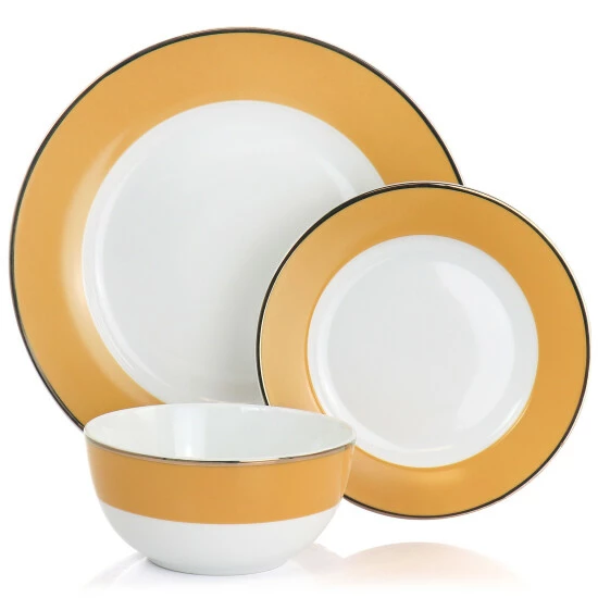 Make your dining experience special with this gold rimmed 12 piece dinnerware by Martha Stewart! Formal or relaxed, your table setting sets the tone for your entire occasion. Use this gold rimmed set to display your unique style and showcase your favorite dishes. Designed with a colored edge and gold plated rim, this set adds some color and class to any meal. It comes with service for four people, including dinner plates, salad plates, and cereal bowls. Fine ceramic construction is lightweight and durable, hand wash only.