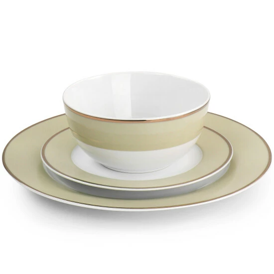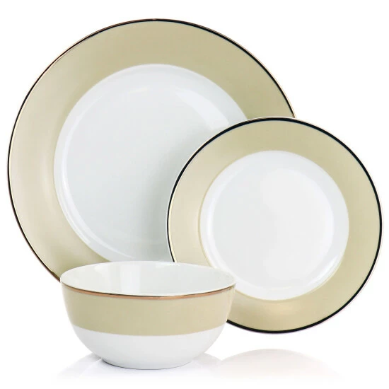 Make your dining experience special with this gold rimmed 12 piece dinnerware by Martha Stewart! Formal or relaxed, your table setting sets the tone for your entire occasion. Use this gold rimmed set to display your unique style and showcase your favorite dishes. Designed with a colored edge and gold plated rim, this set adds some color and class to any meal. It comes with service for four people, including dinner plates, salad plates, and cereal bowls. Fine ceramic construction is lightweight and durable, hand wash only.