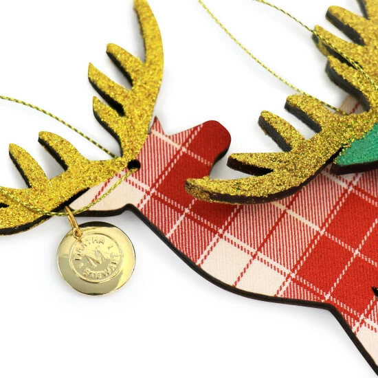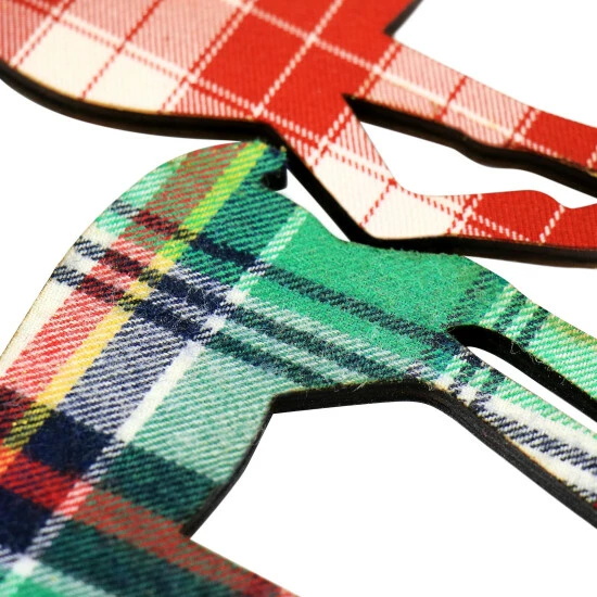 The Martha Stewart Reindeer 4 piece ornament set is colorful, fun, and will add some modern style to your tree. Reindeer shaped wooden ornaments are lightweight for stable hanging, and have a soft plaid patterned fabric on both sides to add some unique style to your holiday decor. Each ornament features a loop string hanger with a Martha Stewart emblem charm. Dress up your tree with some color and pattern with this four piece ornament set!