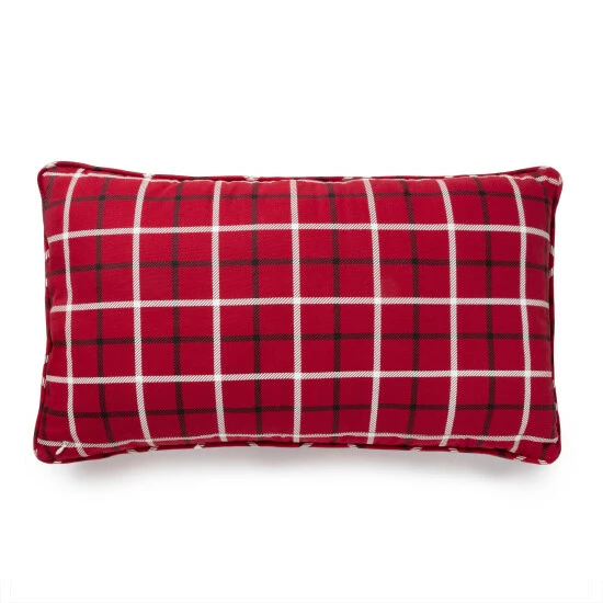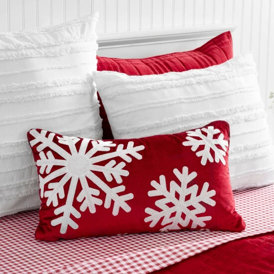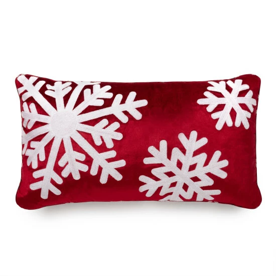 Festively dress up any space with the Holiday Snowflakes decorative pillow by Martha Stewart. Designed and crafted in 100% cotton with print and embroidered details. Classic and clean pipped edges with a hidden zipper closure. Features beautiful white, crewel stitched embroidery details on a cheery red ground with a classic holiday plaid on the reverse side for two looks in one.