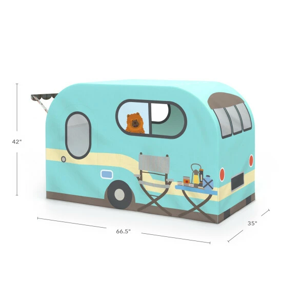 Bring all the fun of camping, right to your child’s playroom. The Martha Stewart Kids’ Camper Play Tent inspires pretend play and encourages children ages 3 and up to use their imagination. Easily fit the washable fabric tent over the durable steel frame and instantly transport your child to a playful world created just for them. Assembly required. Assembled tent measures 66.5″L x 35″W x 42″H.