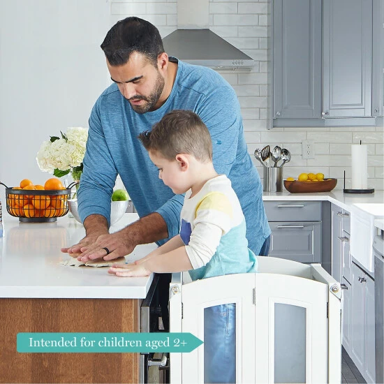 Promote independence, safety and togetherness with the Martha Stewart Kitchen Helper. Securely elevate toddlers and young children to counter height, allowing them to safely join in on moments of family togetherness in the kitchen. Encourage independence and confidence as children take on small tasks and learn while doing. Inset windows, a classic design and contemporary color options allow the Martha Stewart Kitchen Helper to seamlessly integrate into any kitchen. This lightweight, foldable stool is constructed from a durable, easy-to-clean combination of beech solids and birch plywood. Includes mesh Kitchen Helper Keepers for both open sides and a non-slip mat for extra security. Arrives almost completely assembled; simply attach the four stabilizing feet. For ages 2 and up. Measures 23″L x 23″W x 36″H.