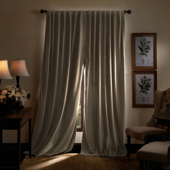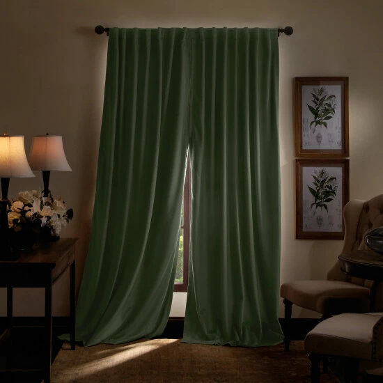 Softly textured and vividly sophisticated, this pair of Lucca velvet blackout window panels comes in two shades, Loden Green and Linen, so that your room finds it style stride, all the time. The blackout lining makes for a tranquil sleep or perfect movie night setting. Panels are available in two lengths 84 inches and 95 inches. ย 100% Polyesterย