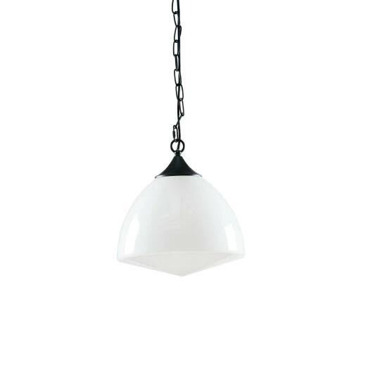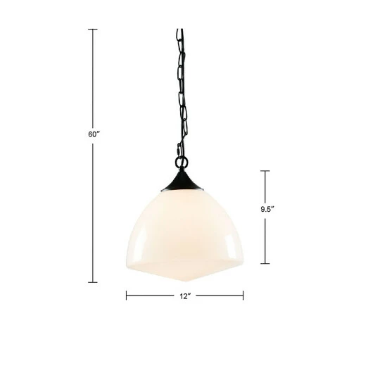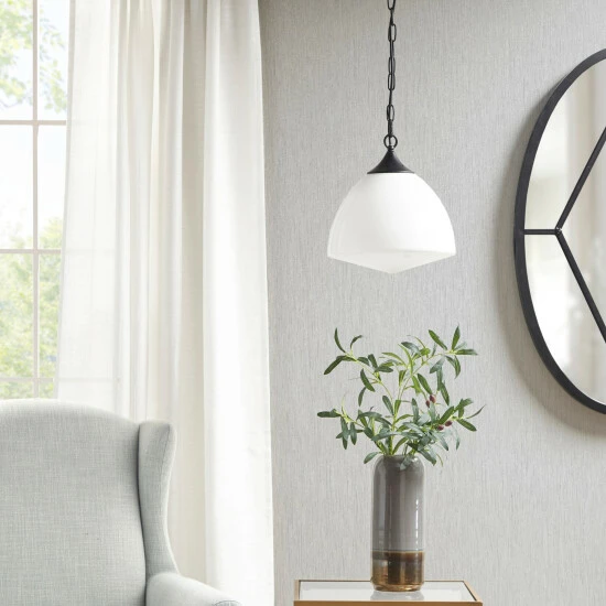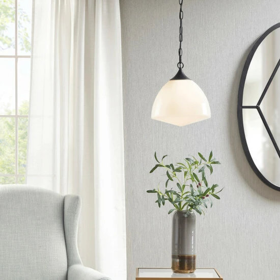The Martha Stewart Lyon Pendant offers a simple and charming update to your home decor. This transitional style pendant features a black metal base with a white glass bowl shade that softly filters the light. With a ceiling drop down height of 0-49-inches and the 47-inch adjustable black cord, you can find the right height to fit your room. Hardwire this pendant to the ceiling in your living room or dining room and give your space a charming touch. Assembly is required. 1 Type A light bulb is needed. Spot clean only.