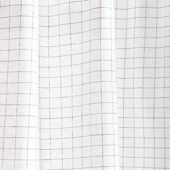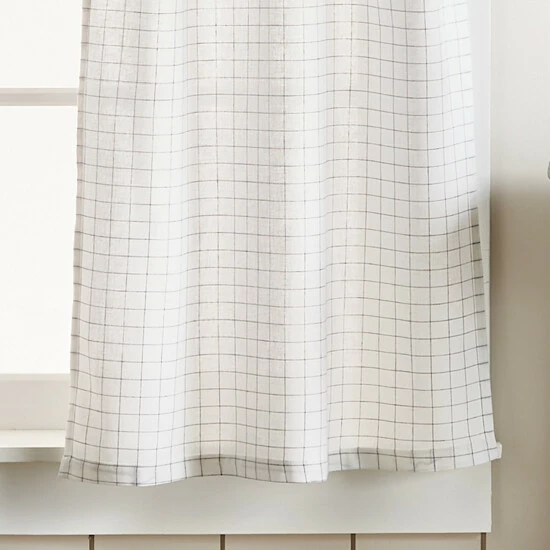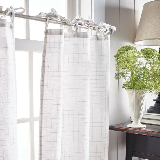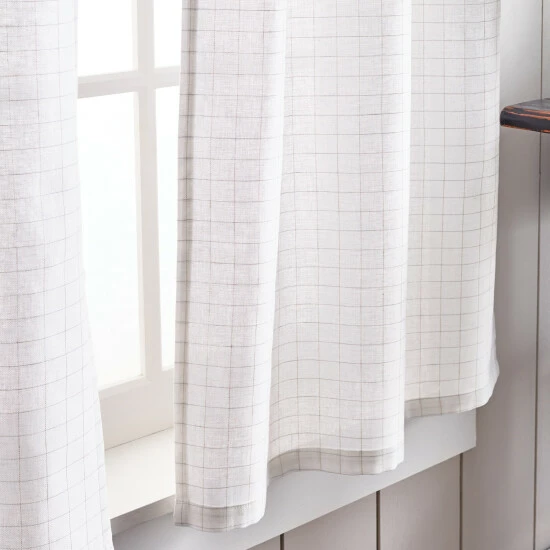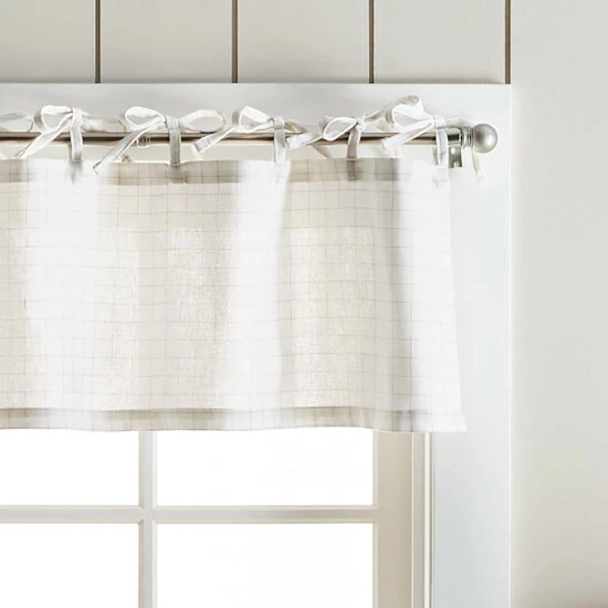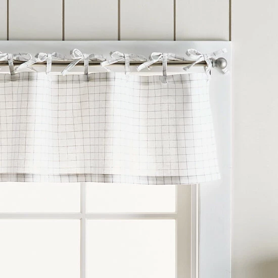 Refresh your room with the stylish fashion of the Martha Stewart Pinstripe Plaid Valance and Tier Set. Slim pinstripes on the face of this set offer a dapper appearance for your space as they form into a grid pattern. The sleek pattern instantly fills your space with classic sophistication that is sure to impress. The tie tab header makes this style easy to hang on a standard curtain rod for a casual chic look. Embrace this look in white and black or white and linen to coordinate with your existing home décor. Natural light will be gently filtered into your space as this tier and valance set is unlined to keep your home inviting. Fashioned with a poly- cotton blend, this set of three can be cared for easily. Simply place this set in a machine wash as needed and you can enjoy this style for the years to come. This 3-piece set includes a valance and two tiers.• 55% polyester, 45% cotton • Tie tabs • Pinstripe pattern • Unlined • Set includes one valance and two pairs • 54″X14″ valance / 27″X36″ tier set • Machine washable • Made in Pakistan