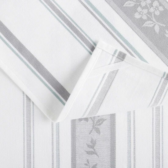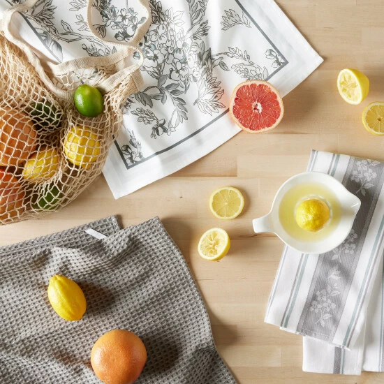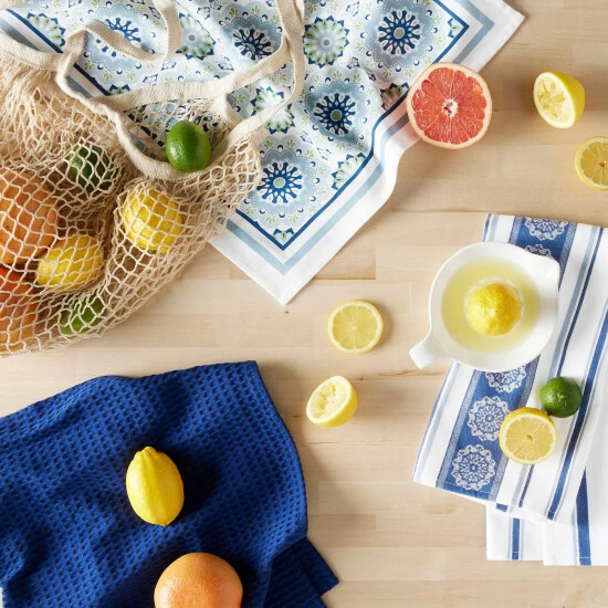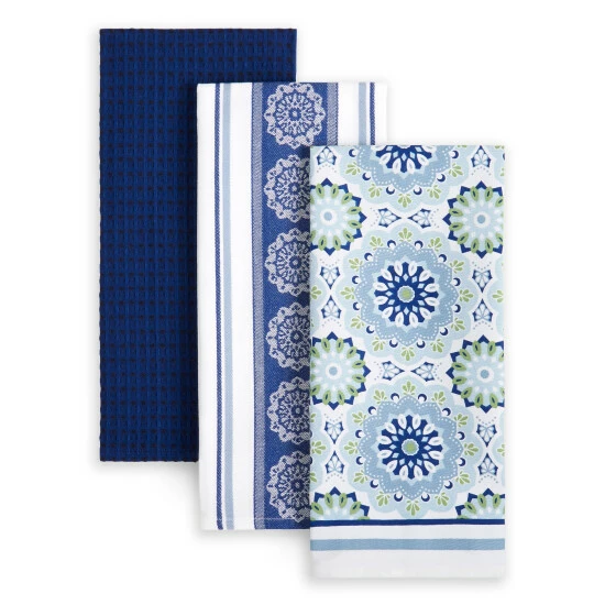 Keep your kitchen stylish and clean with the Martha Stewart Printed Towel 3-Pack Set. Made from 100% flat-woven cotton, this set includes one solid towel and two medallion printed towels with jacquard border for an elegant look. Each kitchen towel measures 18 inches by 28 inches. These machine washable kitchen towels are thick and durable for your daily tasks. They’re absorbent, non-abrasive and virtually lint-free. Perfect for sopping up spills, drying glassware and cleaning dishes.