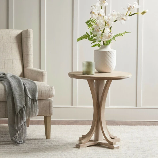 Created exclusively for the Martha Stewart Bedford furniture collection that embodies country farmhouse living, the Fatima Accent Table adds a simple and rustic allure to your home decor. Β This round accent table features an ash veneer top with reclaimed wheat cross leg base that creates a charming farmhouse appeal. At her country farmhouse, Martha enjoys bringing the outdoors in. This functional and practical lifestyle is evidenced in her thoughtfully appointed decor which embraces a neutral color palette that acts as a perfect backdrop to four seasons of color. Assembly required.