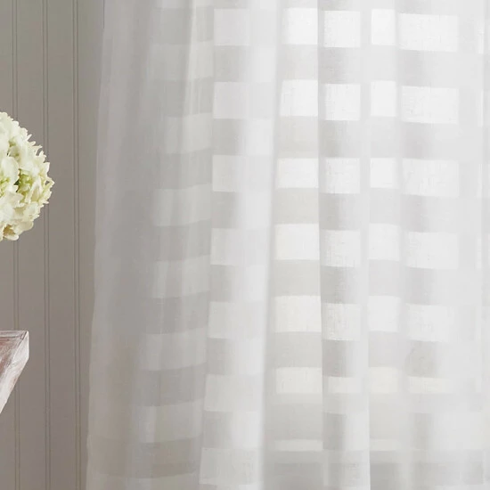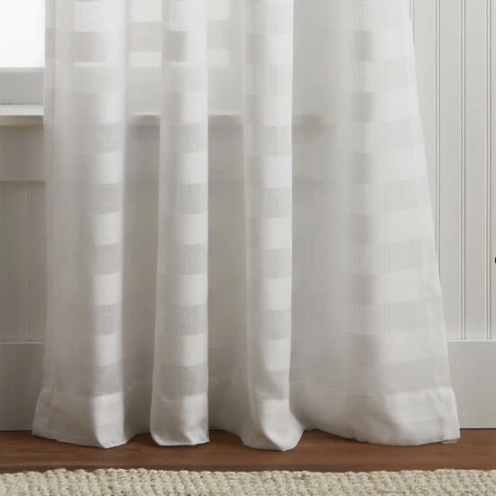Breathe a breath of refreshing charm into your space with the Martha Stewart Sandy Sheer Curtain Panel Pair. Satisfy your beach cottage style with this relaxing, cheerful look that opens up the room with a soft wash of color. Natural light will fill the room with this sheer panel to leave a bright impression. Horizontal woven stripes on the airy sheer perks up the room with a stylish finishing touch. The 3” rod pocket header makes for effortless hanging and a casual chic look for your windows. Choose from 84” or 95” to make this look all your own. This set of two is ideal for dressing your windows with a full look using a standard curtain rod of your choice. Made of 100% polyester, this panel pair is easy to care for with a durable, long- lasting design. To keep this style clean and tidy place this set in a machine wash as needed.•100% polyester•Rod pocket•Sheer•Unlined•Horizontal stripes on sheer•84” or 95”•Set of two•Made in China