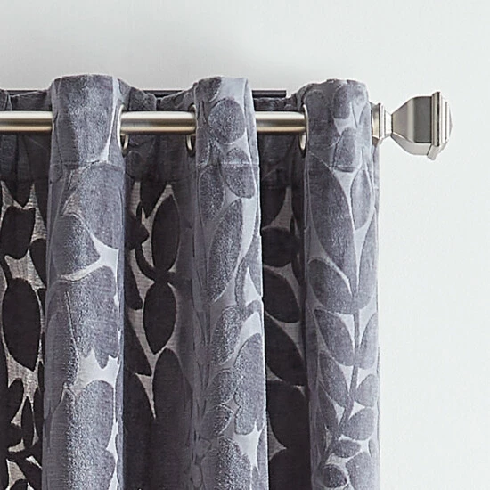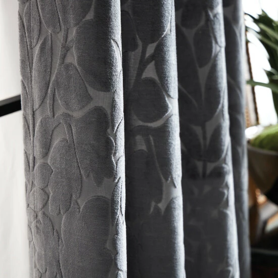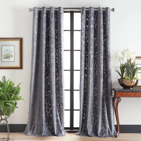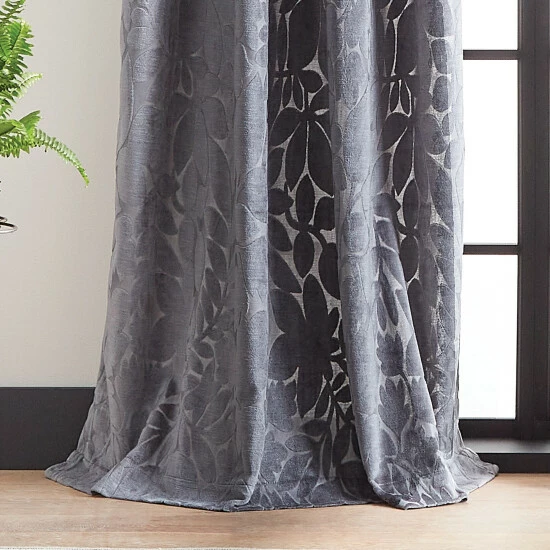 The Martha Stewart Sherwood Velvet Curtain Panel lends a luxurious look and feel into your home. Growing botanicals with a cut velvet design touches the room with soft texture and timeless elegance. The velvet and sheer contrast offers interest and eye- catching detail. With sheer peaks between the botanical pattern, this panel pair lets natural light flow in seamlessly. This panel pair is ideal for formally entertaining guests, but also to satisfy your need for luxurious details. In either teal or grey, this window linen is complemented with brushed nickel grommets. This top header lends stylish touch but also makes for easy hanging on a standard curtain rod. The grommets have a 1.5” opening for easy hanging on a curtain rod of your choice. With eight grommets on each panel this pair will drape beautifully by your windows. This set of two is offered in two lengths, select from either 50”x84” or 50”x95”. For a full look outfit your window with both curtain panels.โข100% polyester โข1.5” Grommet โขCut velvetโขUnlined โข84” or 95”โขSet of two โขMade in China