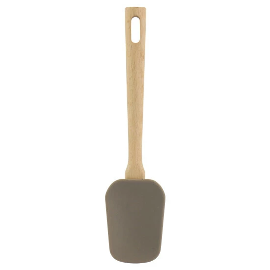 Grab out of reach corners of jars and containers with the Martha Stewart Silicone Mini Spoonula in Gray. Features a flexible silicone spoon with a wood handle. The silicone material is heat resistant up to 445 degrees F for high heat cooking jobs. The soft silicone is safe to use over nonstick surface cookware and prevents unwanted scratches. Hand wash only for long lasting quality and use. Ideal for scraping jams, purees, syrups and other ingredients stored in small containers.