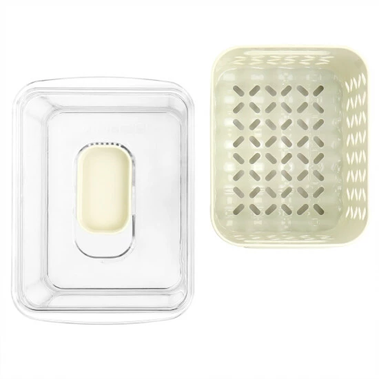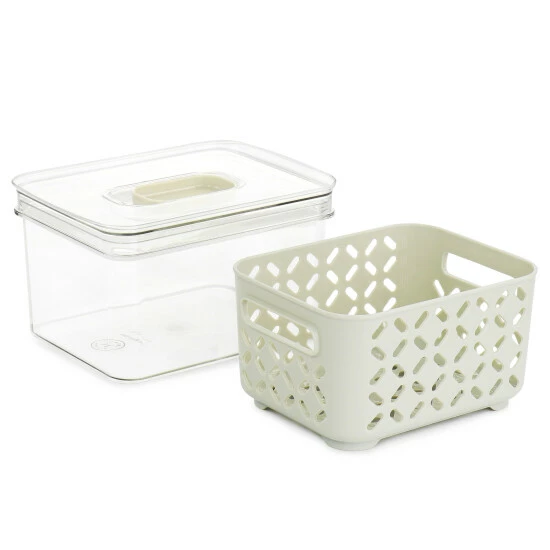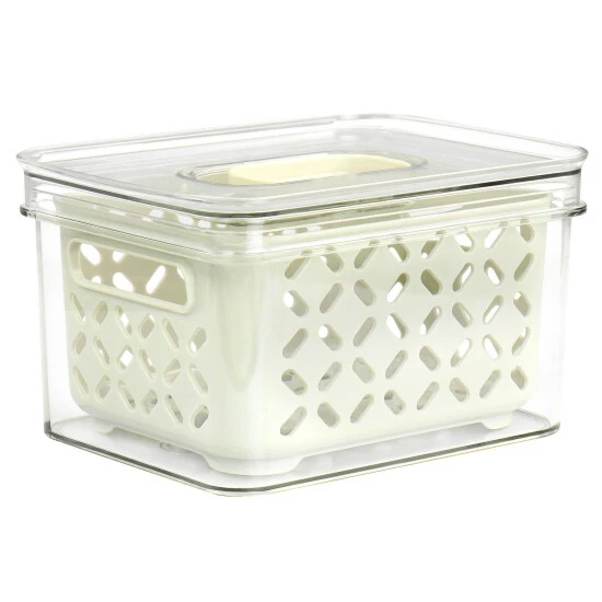 This Martha Stewart Fresh Keeper Container is the perfect container when you need to keep food well ventilated and well contained. This set comes with a removable basket and outer container with a vented lid slider. The removable basket can act as a colander to wash produce while the elevated bottom promotes airflow and a space for liquid drainage to prevent spoiling. Vented lid at top controls humidity to keep different food types fresh. This Dual function set can be used as one piece or separated and saves you space with its stackable storage design!Hand Wash OnlyMaterial: Plastic (BPA Free)Color: Clear/BeigeVented Slider Lid to control humidityElevated Bottom Promotes AirflowStackable Space Saving DesignRemovable Colander Basket for Dual FunctionalityPer Item Measurements:Outer Container with Lid: 5.5in length, 7in width, 4.25in height, 0.6lb weightRemovable Colander: 5in length, 6.2in width, 3.5in height, 0.2lb weight