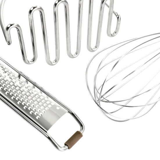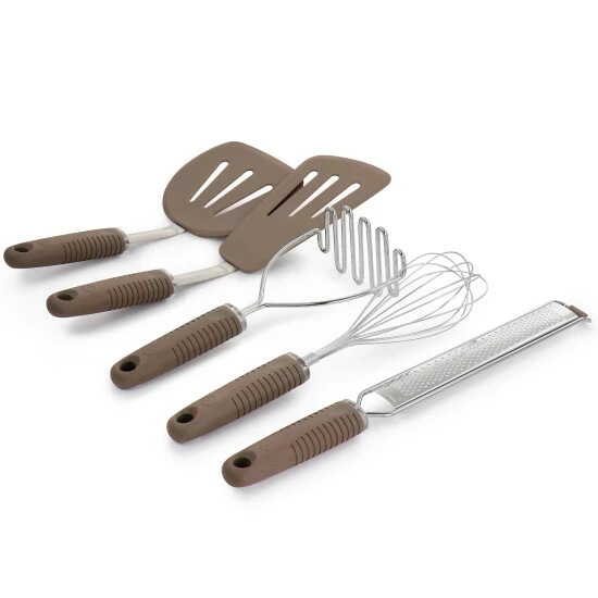When building and curating your kitchenware collection, it’s essential to master the basics. From the mind of someone who has spent countless hours creating every type of meal, these five items have been bundled as the must-have meal prep utensils. The Martha Stewart 5 piece kitchen tool set comes with one masher, one whisk, one long grater, one wide turner, and one fish turner. These tools are crafter with durable stainless steel and flexible silicone with ergonomic soft grip handles. Each utensil handle has built in hanging hole for convenient wall storage.