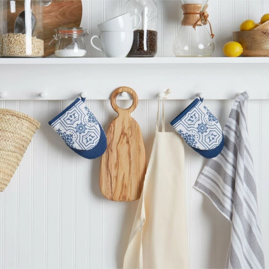 Add style and function to your kitchen dรฉcor with the Martha Stewart Stripe Medallion Mini Oven Mitt Set 2-Pack. Made from thick cotton fabric with cotton lining that offers comfort and insulation. This medallion print mini oven mitt set includes two mini oven mitts that each measure 5.5 inches wide by 8 inches long for easy on and off use. They are heat resistant and will shield your hands from the heat. Includes a convenient hanging loop for display or easy storage. Machine washable for easy cleaning.