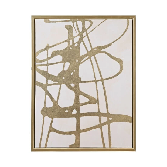 Make a statement in your home with the Martha Stewart Study in Gold & White Framed Canvas by Artist Edith Phelps. A gold abstract design adorns the white canvas to create a bold and striking look, while the gold frame adds the finishing touch for an elevated update. 2 D-rings on the reverse makes this contemporary art easy to hang in any room or space. Measuring 25.81×33.81″ and simply stunning, this framed canvas wall art adds an eye-catching modern allure to your living room or home office. Spot clean only.