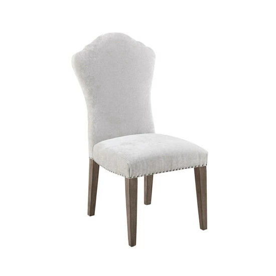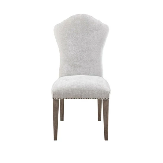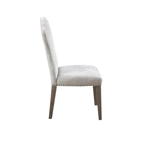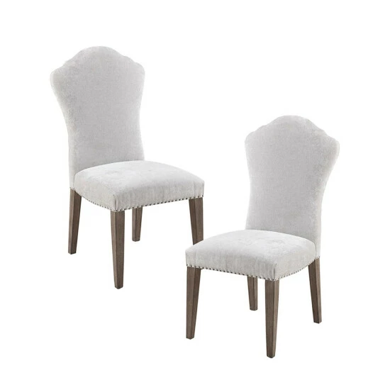 Complete your dining room with the Martha Stewart Tristan Dining Chair 2 Piece Set. Each dining chair features an upholstered high back and seat with a grey finish on the solid wood legs, creating a charming farmhouse look. A pewter nail head trim along the seat adds an elegant accent to the design. Assembly required, tools included.